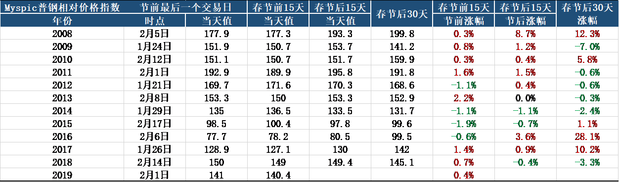 具體價(jià)格方面,從往年Myspic普鋼先對(duì)價(jià)格指數(shù)的春節(jié)前后對(duì)比來(lái)看,最近十年有70%的概率節(jié)日前后15日價(jià)格漲跌趨勢(shì)一致。2019年春節(jié)前15日鋼價(jià)指數(shù)累計(jì)小幅上漲0.4%,預(yù)計(jì)開(kāi)門紅行情大概率出現(xiàn)。