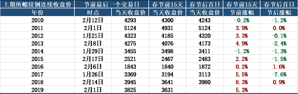 再看期貨,從螺紋鋼上市十年春節(jié)前后價(jià)格對(duì)比來(lái)看,節(jié)前15日呈上漲趨勢(shì)的概率較大,但是節(jié)后價(jià)格跌破節(jié)前最后一日收盤價(jià)是大概率事件,今年需警惕類似價(jià)格走勢(shì)的出現(xiàn)。