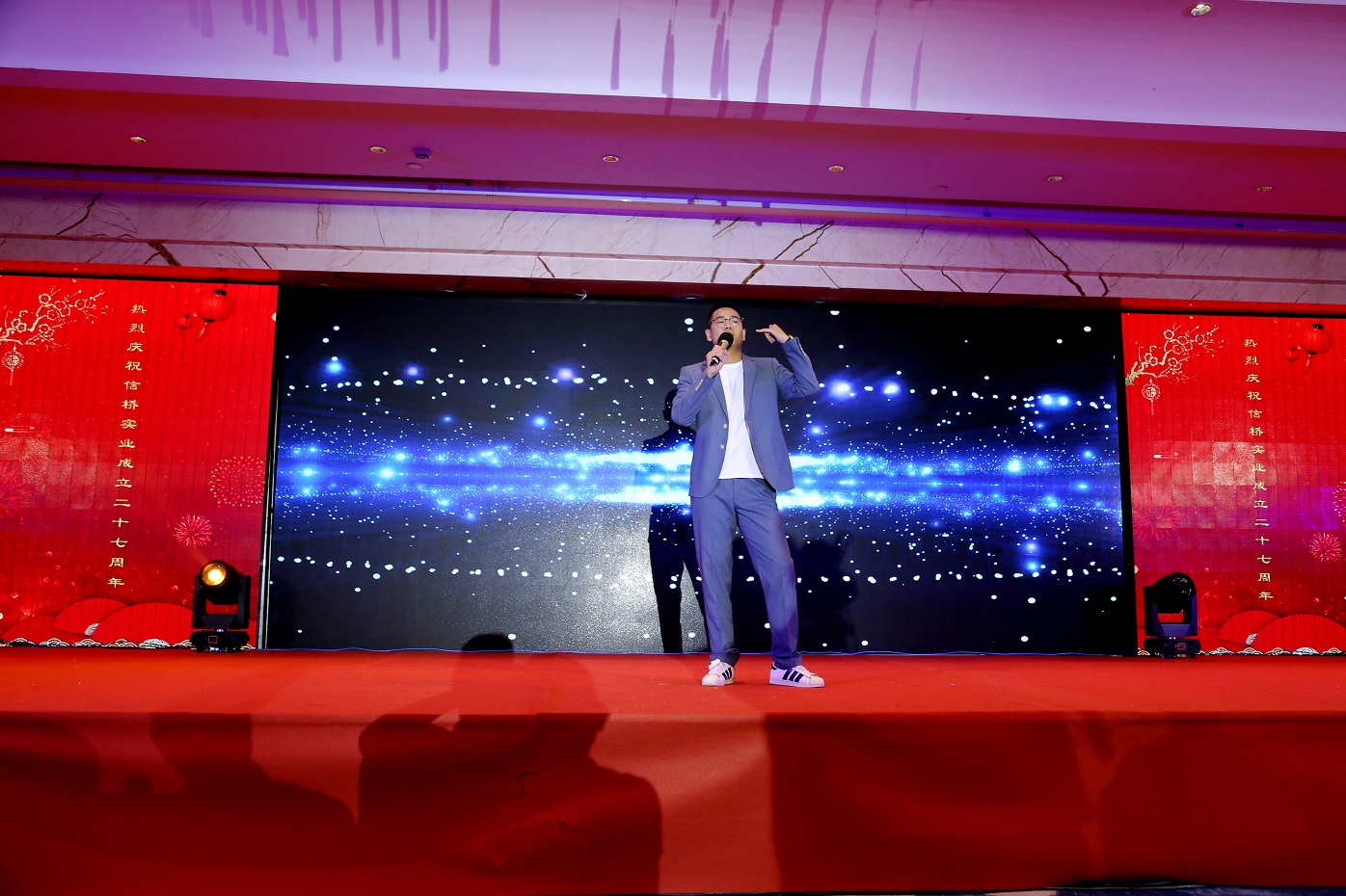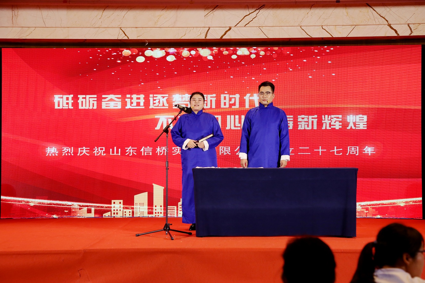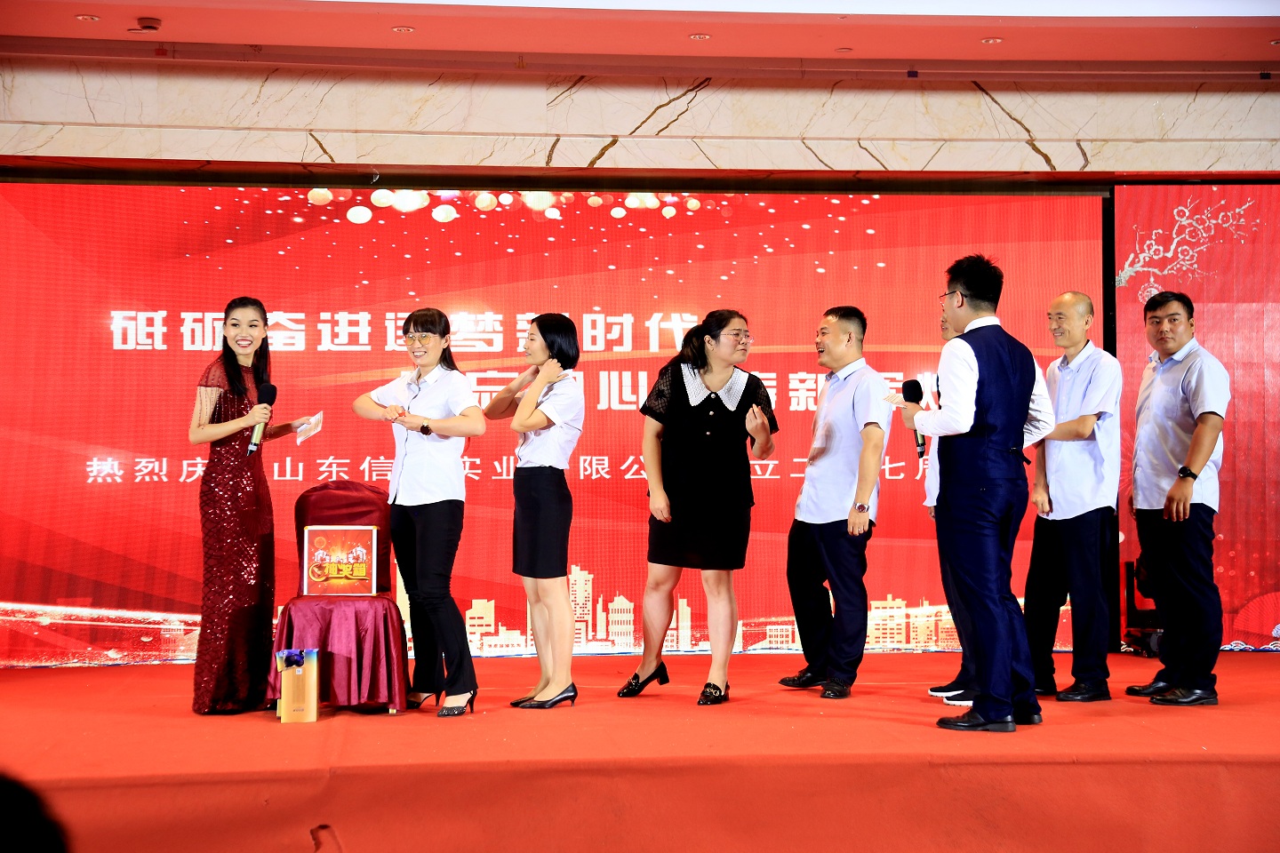 此次慶典晚宴參加人員除了信橋全體員工之外,還有部分老領(lǐng)導(dǎo)和老朋友,大家共同分享了信橋二十七周年的喜悅與精彩。八號上午,慶典開始之前,演員們辛勤排練,燈光師、音響師共同配合,所有人為了晚會都在努力。下午4點(diǎn)58分,晚會正式開始,全體員工與領(lǐng)導(dǎo)集體合影,信橋隊伍不斷在擴(kuò)大。今年的晚會添加新的互動方式,采用了直播和紅包雨的新形式,是信橋周年慶典的一次新的嘗試。